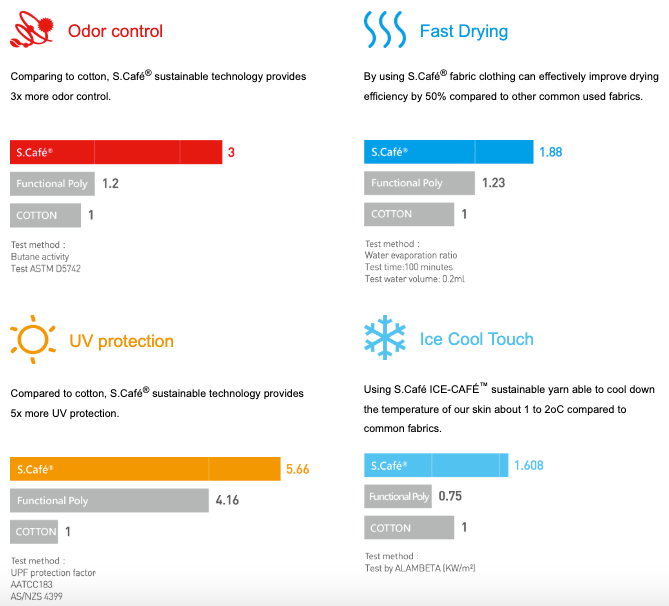 Ever imagine that the coffee we drink being transformed into the apparels we wear? Fascinating, isn’t it? Now, S. Café® technology turns our dream into reality. With a low-temperature, high-pressure and energy saving process, S. Café® technology combines coffee grounds onto the yarn surface, changing the characteristics of the filament, and offers up to 200% faster drying time compared to cotton. Also, the micro-pores on S. Café® coffee grounds absorb odors and reflect UV rays all the time!